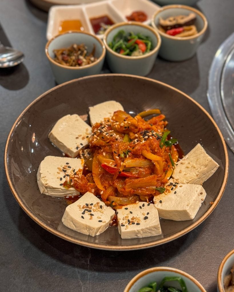 Balance everything out with hearty “a la carte” dishes like Kimchijeon, Topokki, and Dubu-Kimchi, sliced beancurd served with stir-fried ripened kimchi and pork.