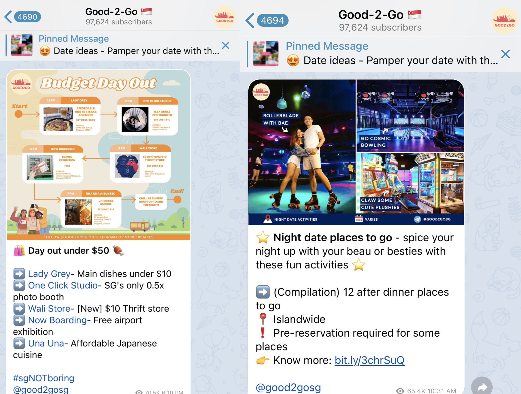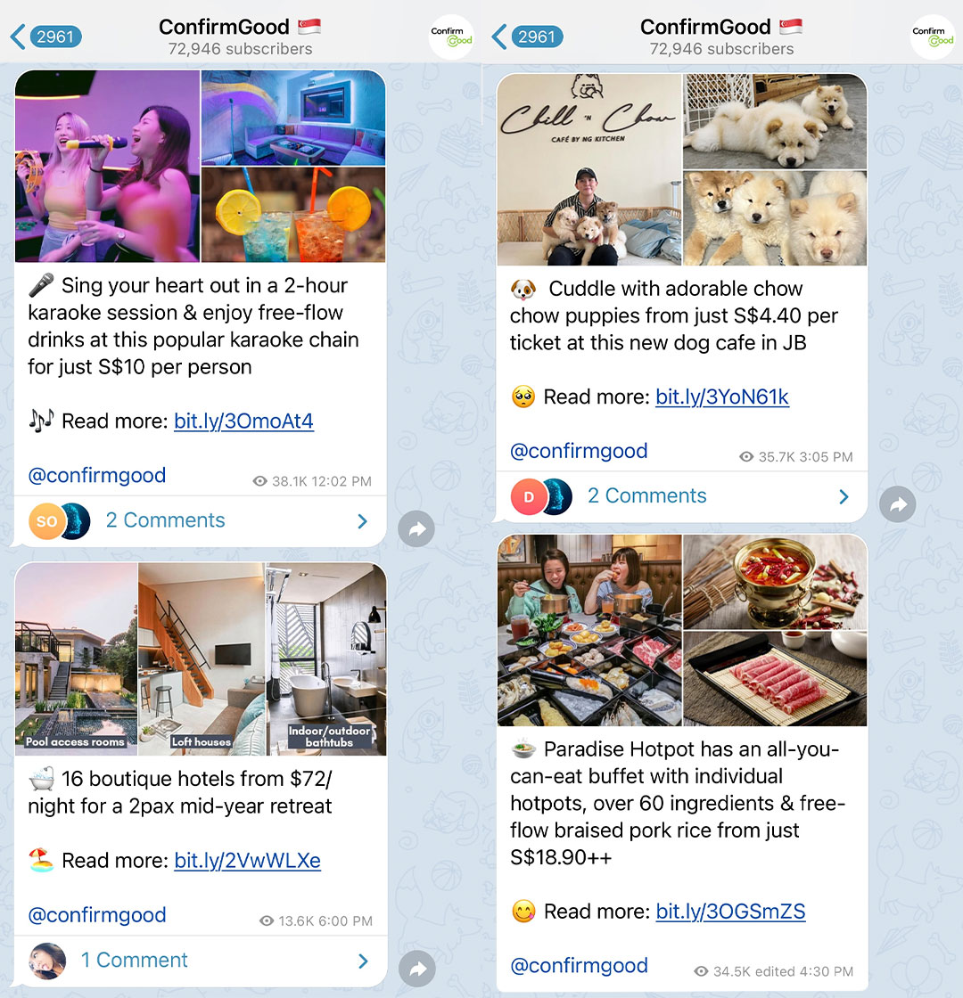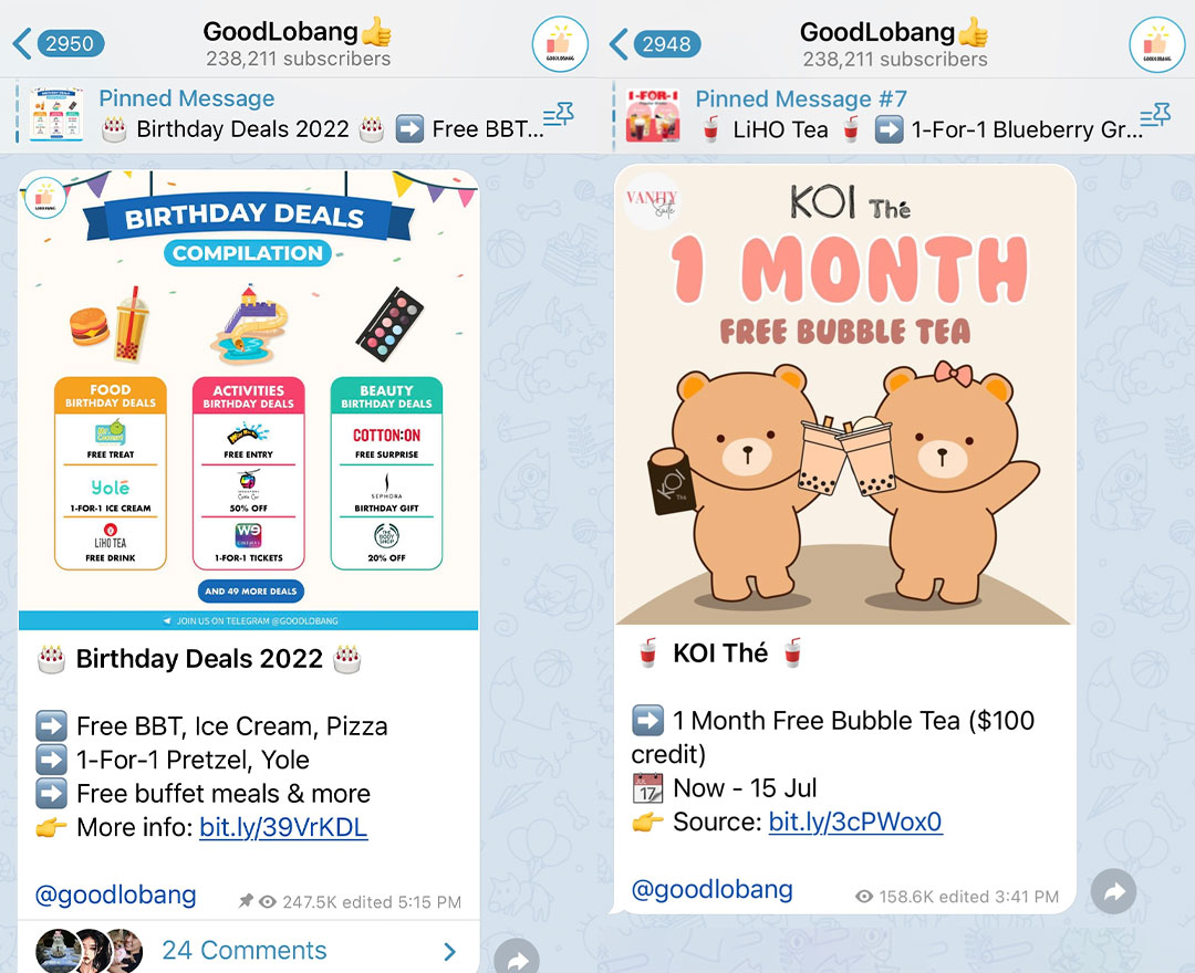 GoodLobang is the Telegram channel with the most subscribers in Singapore — and for good reason too. The group shares an astounding variety of Singaporean deals and promotions offering the best value for money, along with all the latest lifestyle news updates and recommendations you wouldn’t want to miss.