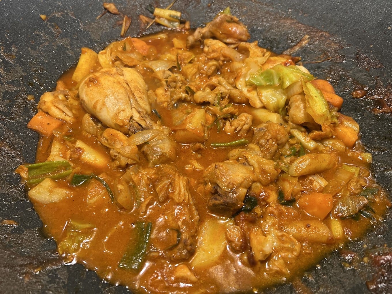 This spicy, stir-fried chicken dish is loaded with juicy chicken chunks, soft potatoes, crunchy veggies, and chewy rice cakes, all drenched in a rich gochujang-based sauce.