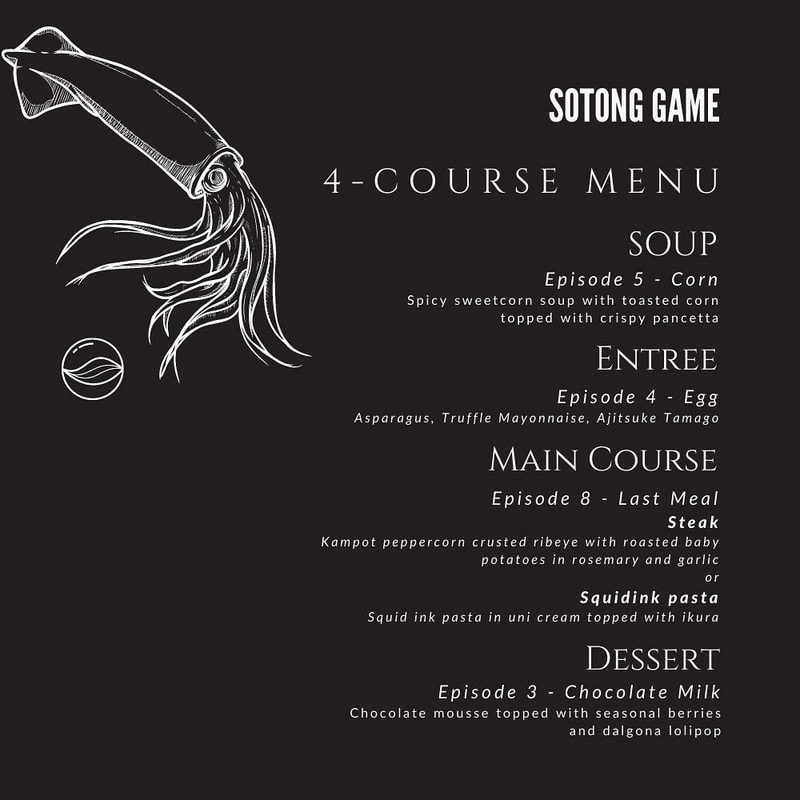 Episode 8, the dinner’s third course, is one that’s hard to forget. It’s none other than the fateful last meal which the last three players were served the night before they were expected to take on the last game. Some might even draw parallels as the show’s last supper. Here at Sotong Game though, you’ll be served a peppercorn crusted ribeye with roasted baby potatoes in rosemary and garlic.