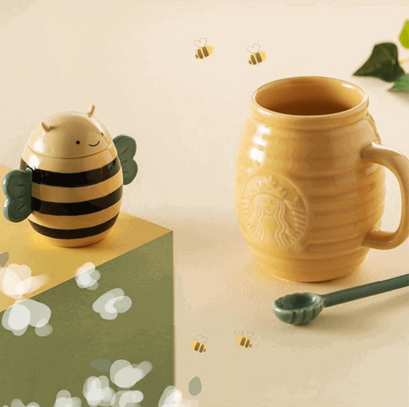 The collection consists of bee-themed mugs, tumblers, and even a keychain to complete the set.