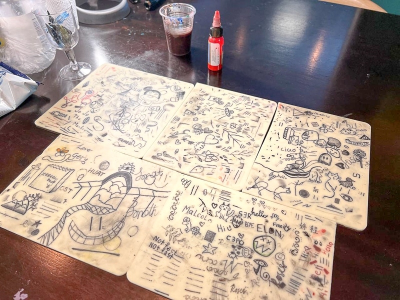 The space seats two groups of four participants, and each station comes fully-equipped with all you could possibly need for the next three hours. This includes high-grade ink that’s suitable for use on human skin — but of course, don’t go tattooing yourselves now, not in this non-sterile environment, nor economy.