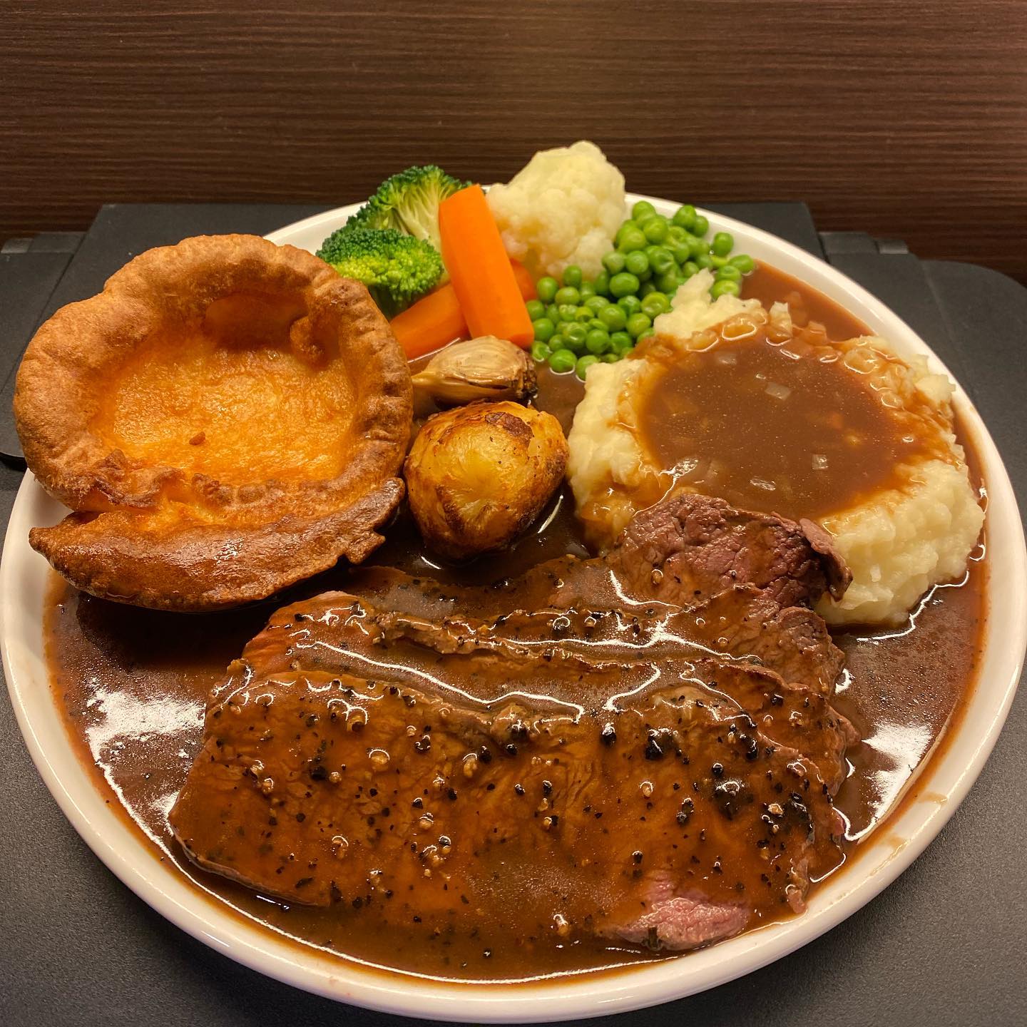Also known as a roast dinner, this traditional British and Irish meal, which is traditionally consumed on Sunday, consists of roasted meat, vegetables, potatoes, and accompaniments such as gravy, condiments, and most notably, savoury baked Yorkshire pudding.