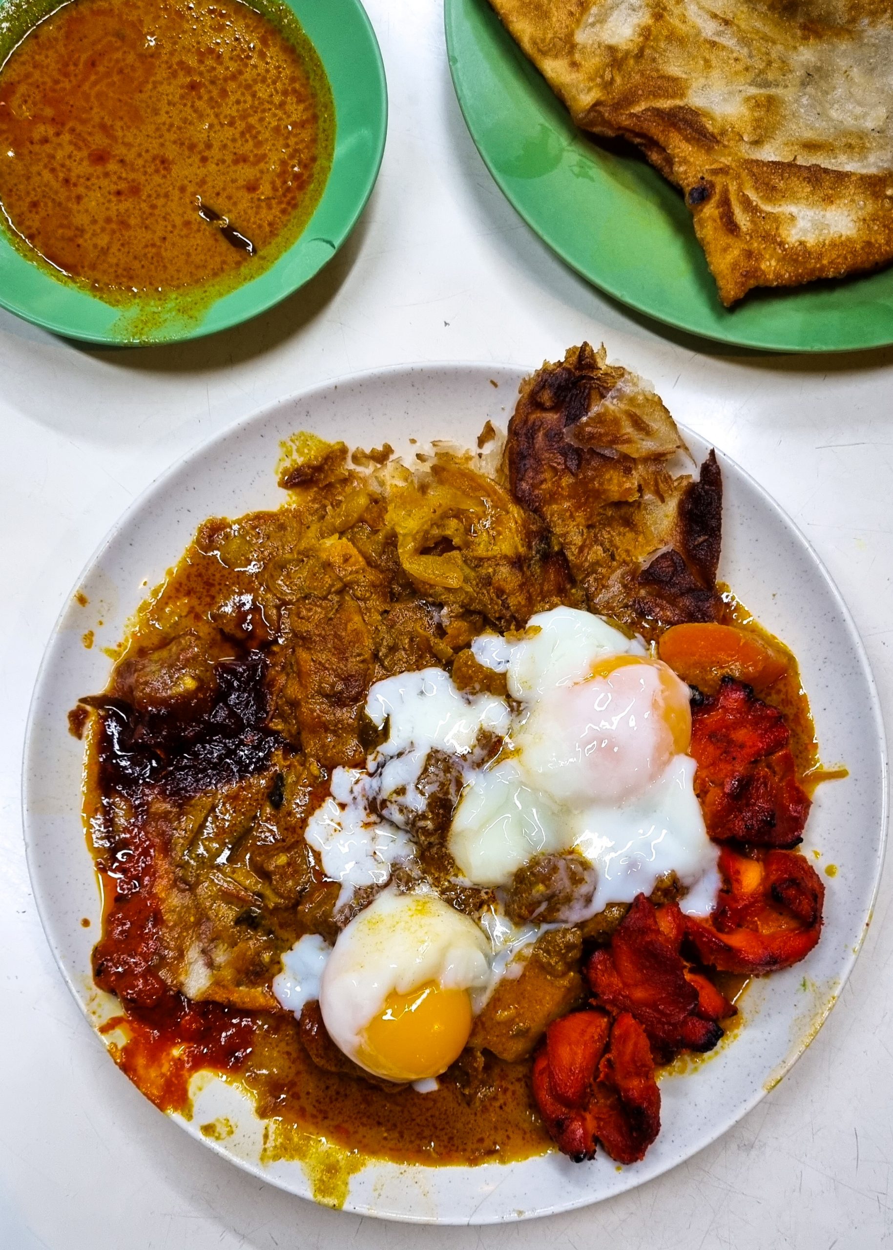 You won’t go wrong with any of the prata selections, but the bustling eatery is perhaps best known for its legendary R.K. Special, also known as Prata Tsunami. Crispy kosong prata is torn into pieces and slathered in a mixture of curries, sambal, mutton chunks, chicken thigh, and two runny soft-boiled eggs — very sinful, but oh-so-satisfying.