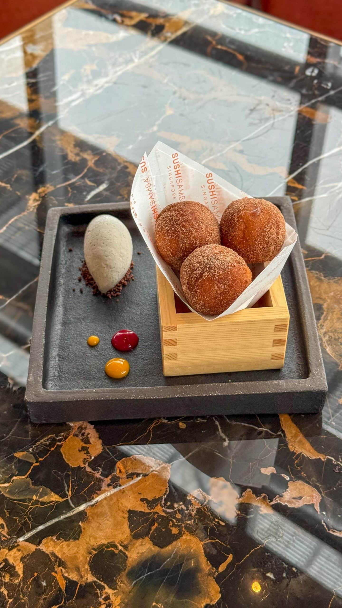 First up is the Yuzu Cheesecake, a creamy and sour delight with Hokkaido milk ice cream and caramelised biscuit. The Doughnut Andagi is a light, crispy, and chewy rounded-up ball with black sesame ice cream on the side.