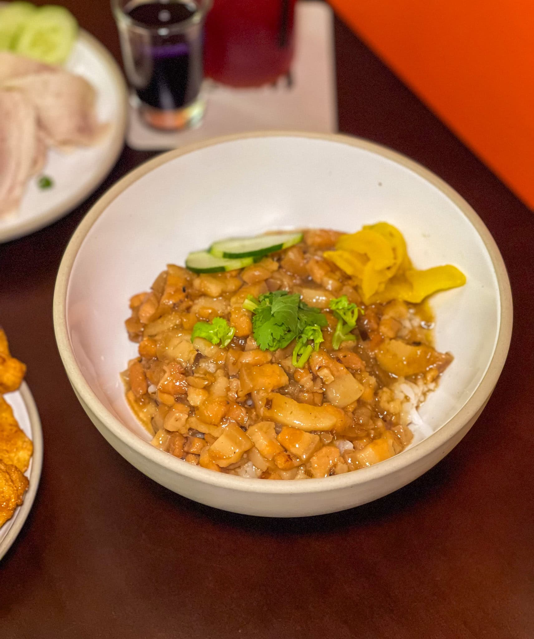 It comprises sweet and tender braised pork atop fluffy white rice and garnished with coriander and pickled radish. You also have the choice to add-on onsen egg (S$2) or a fried sunny side-up (S$1.50).