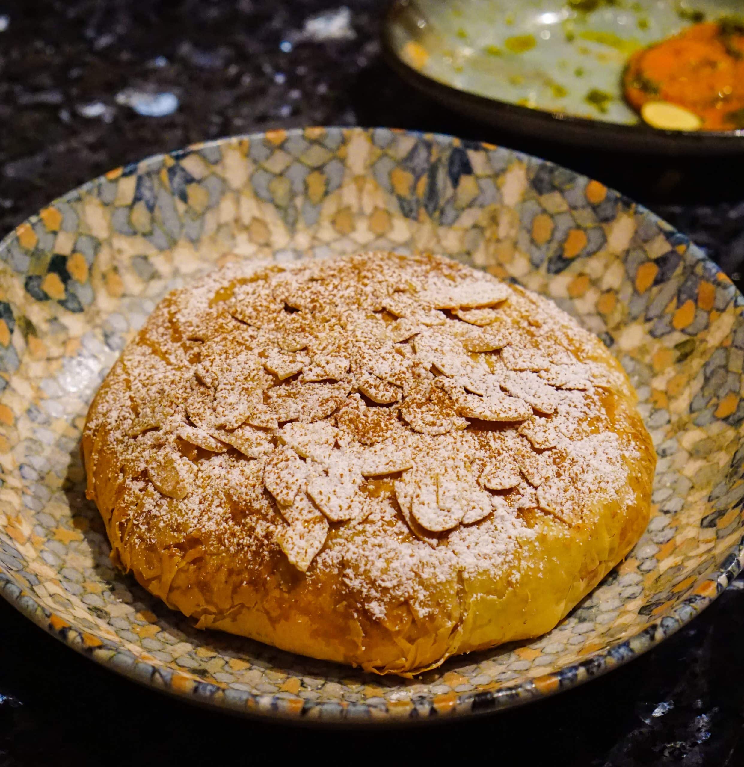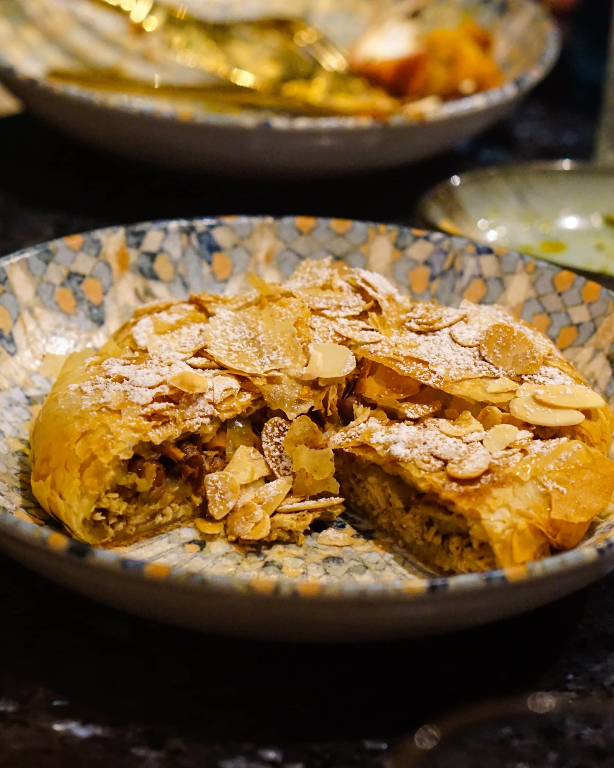 Moving to the mains, you’ve got to order at least one pastilla, a traditional savoury filo pastry pie stuffed with slow-cooked meats, spiced, dried fruits, and nuts. And no, it’s not a dessert, despite its powdered sugar-covered exterior.