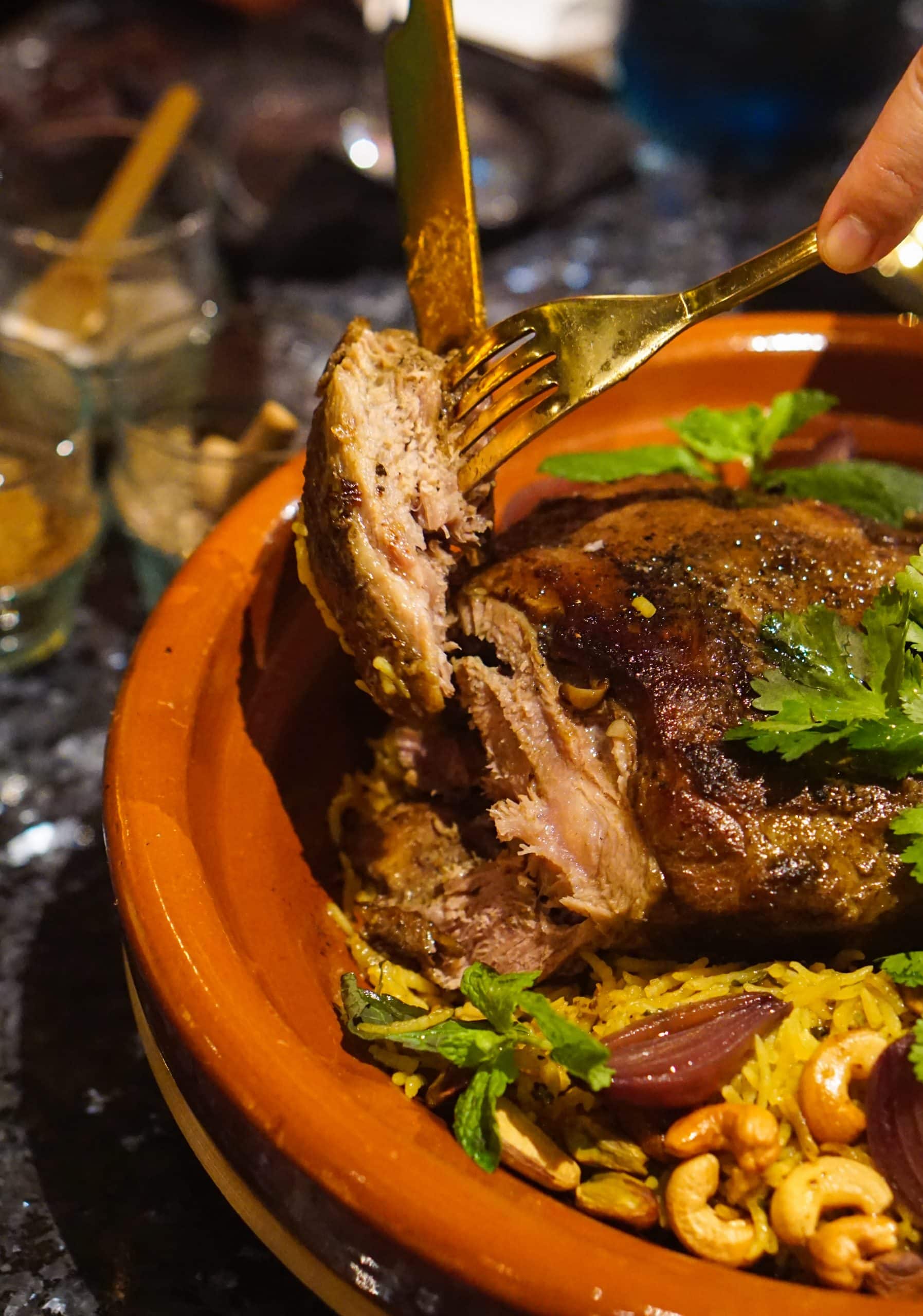 This massive hunk of tender, flavour-packed bone-in lamb is served atop Ras El Hanout basmati rice pilaf, dried fruits, and cashews (think biryani, but a lot more dramatic) — a centrepiece that’s bound to get your guests talking!