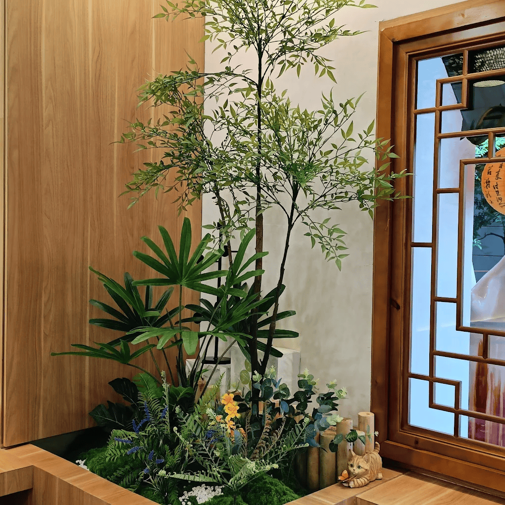 Step into a quaint space with wooden elements and lots of greenery, complete with curated oriental decorations.