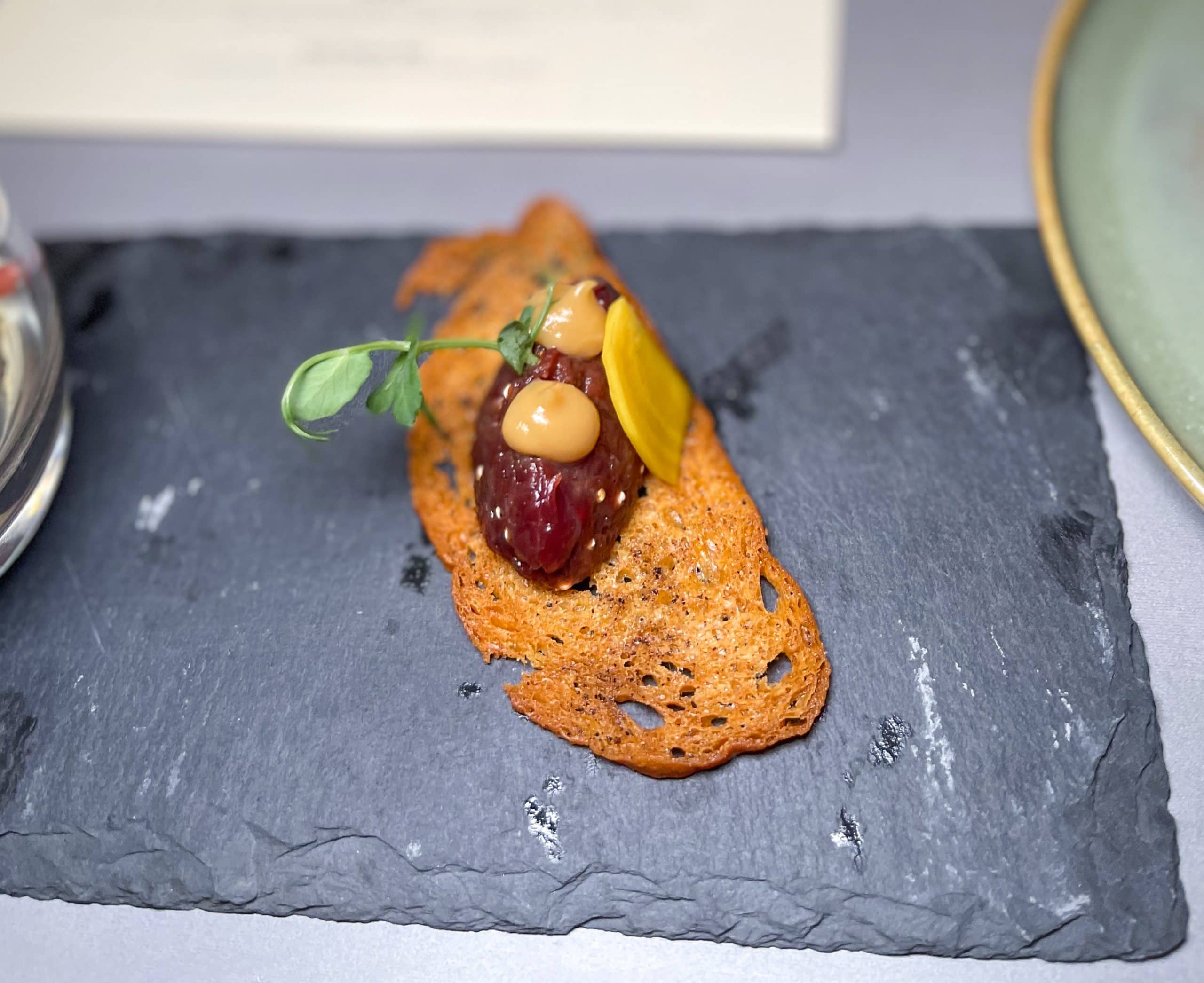 Another dish that really caught my attention was the Puffed Beef Tendon. You might be thinking ‘what’s so special about beef?’ But hear me out. The dish starred a thin slice of braised beef tendon that was dehydrated for two days, before deep-fried to a keropok-like texture. It was then topped with jamon iberico and kaluga caviar for an added smokiness.