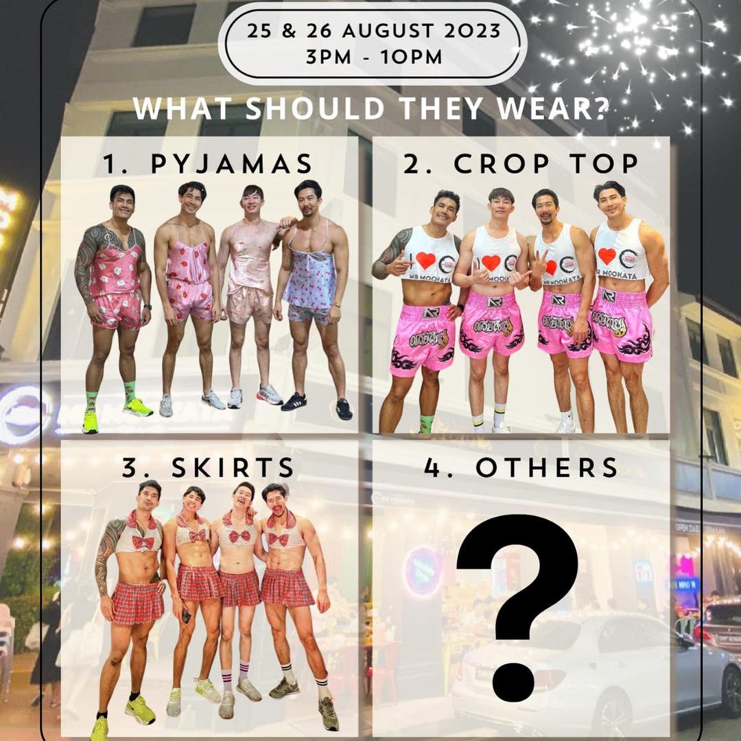 To keep things a surprise, Mr Mookata has put up a poll on Facebook asking you to choose what clothes you want the guys to wear. Feel free to cast your vote — I’m curious to see what the mystery outfit is (if they even wear any that is).
