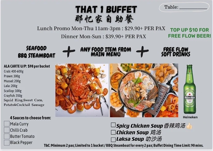 Every two persons are entitled to either one seafood bucket or BBQ steamboat; if you dine in a group of four, you’ll get to order both.