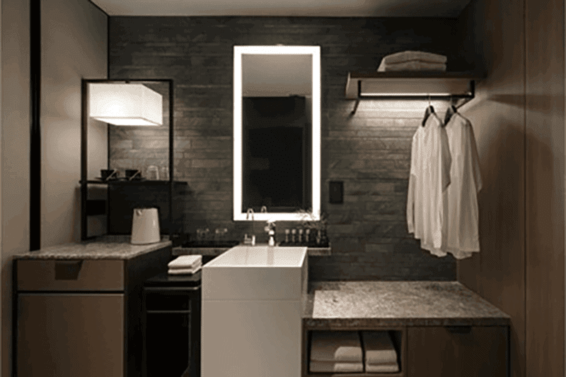 The bathroom doesn’t fall short either. All bathrooms are decked with a rain shower and a mirror surrounded by LED lights—this’ll help any girl out if she’s planning on dolling up for a date or a night out.