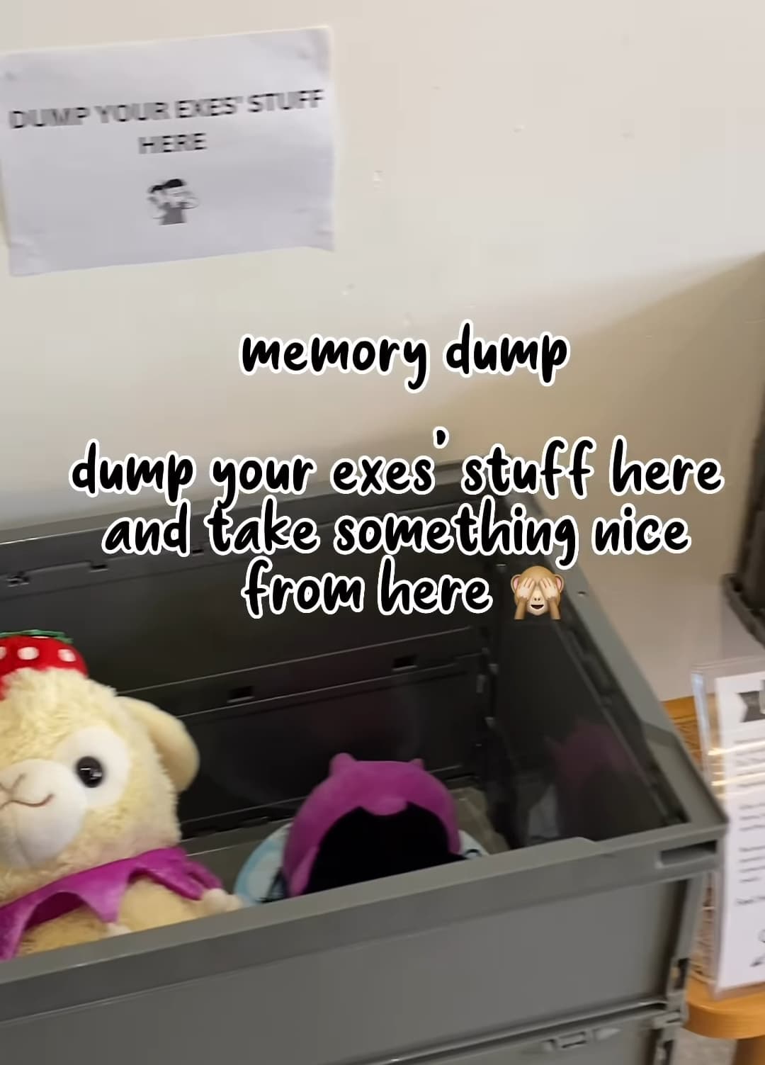 Still holding on to that soft toy from that (ex) special someone? Double it and give it to the next person. Just kidding. You can actually bring it along with you and contribute it to the memory dump box — and even pick up something nice in return. Out with the old, in with the new!