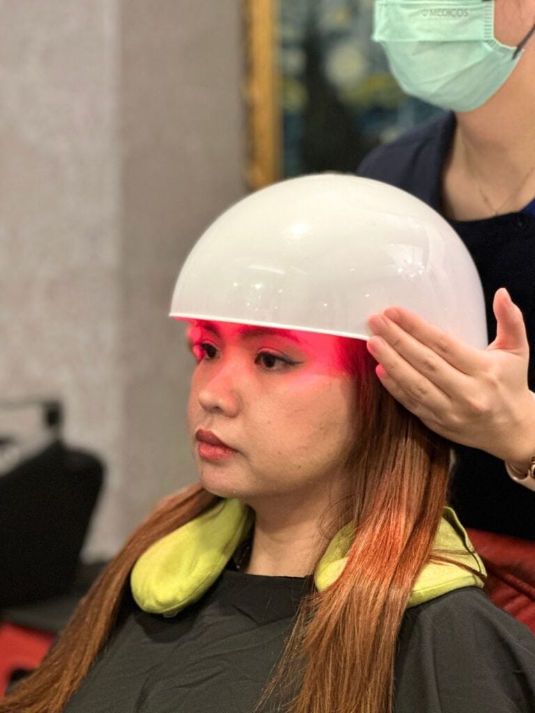 The next step involves an advanced low-level light therapy using TK TrichoKare’s Hair Bang technology. This aids in detoxifying and balancing the pH levels of Colette’s scalp to stimulate hair regrowth and promote blood circulation.
