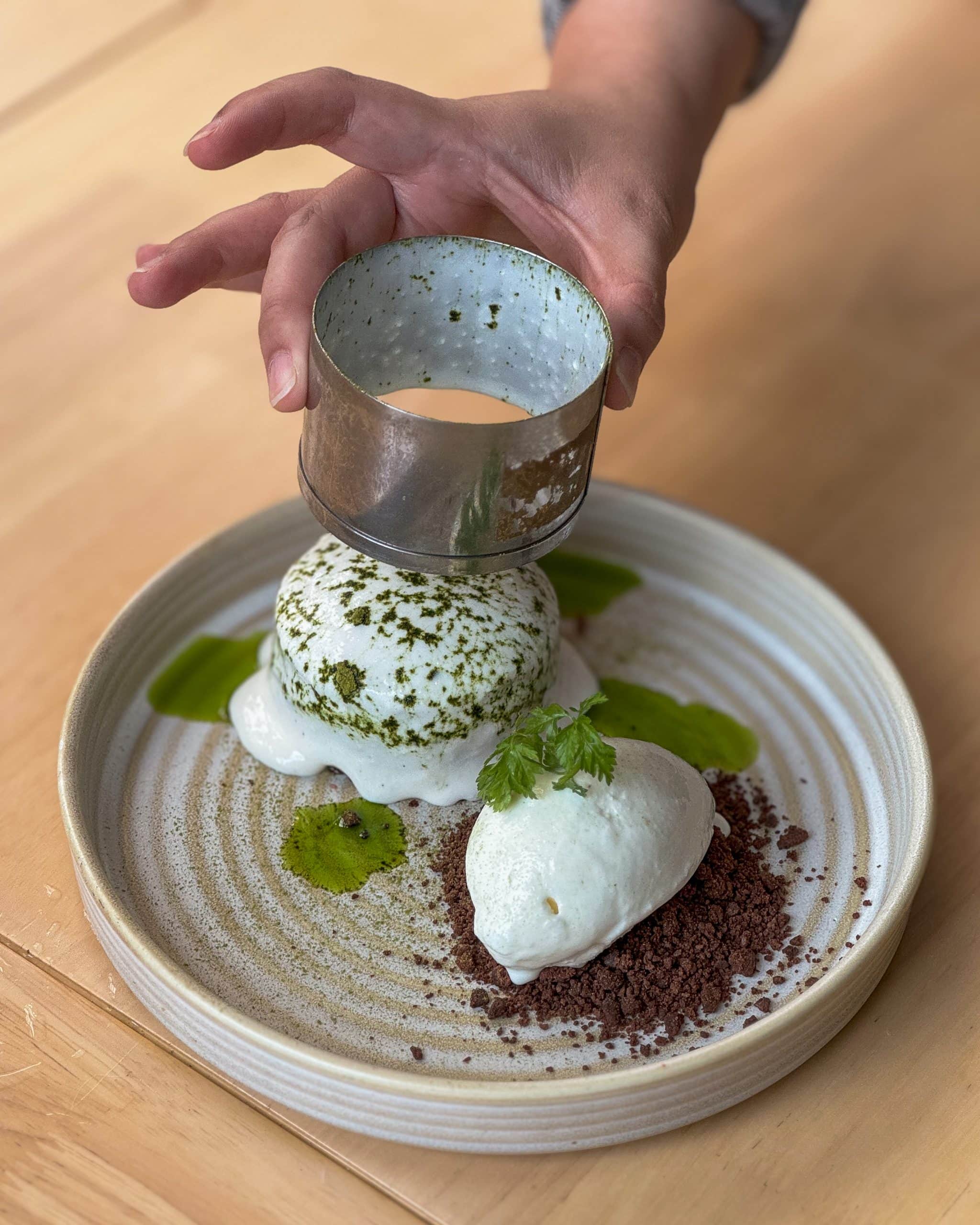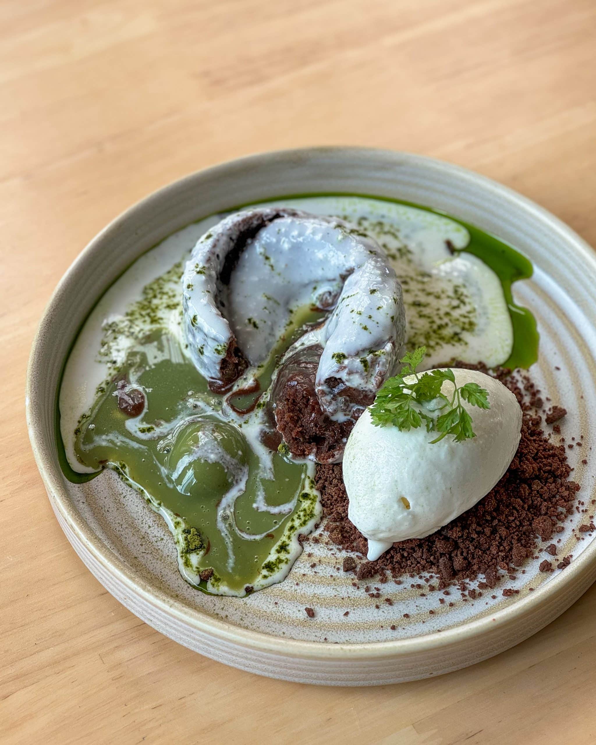 Surprisingly, there are only three desserts on the menu, and so we ordered the Lava Cake (S$12.50), a chocolate cake that broke apart to reveal a molten matcha center, with coconut ice cream and a chocolate crumble on the side.