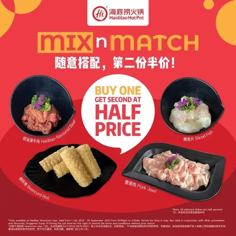 You can also choose to enjoy your late-night supper at Haidilao Downtown East with this limited-time promotion, available daily from 10pm to 2am. The offer is valid for dine-in only, featuring selected half-portion dishes that allow you to mix and match meat and vegetable options.