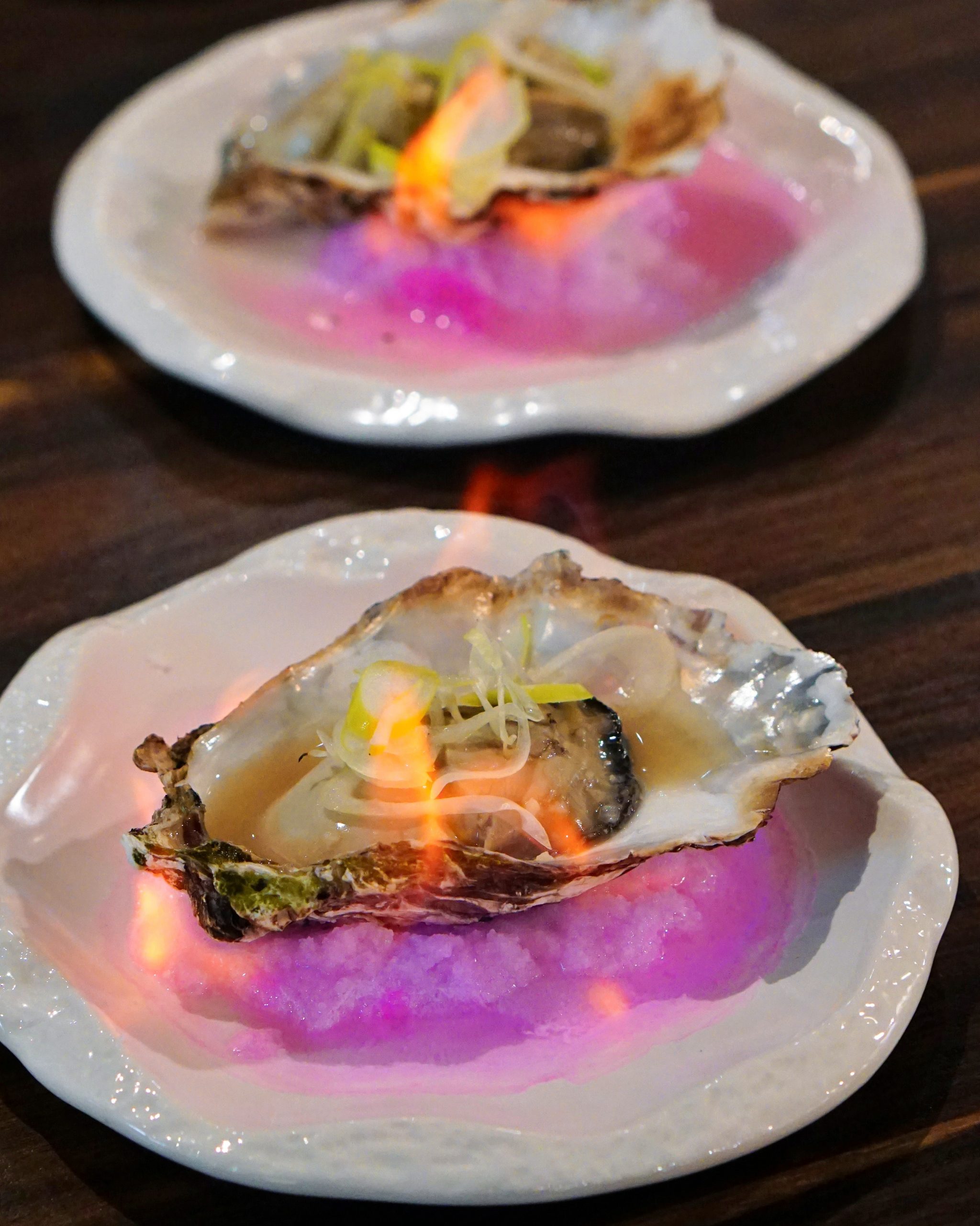 A theatrical display then arrived, in the form of Sake Jumbo Oyster, a binchotan grilled jumbo oyster with sake.