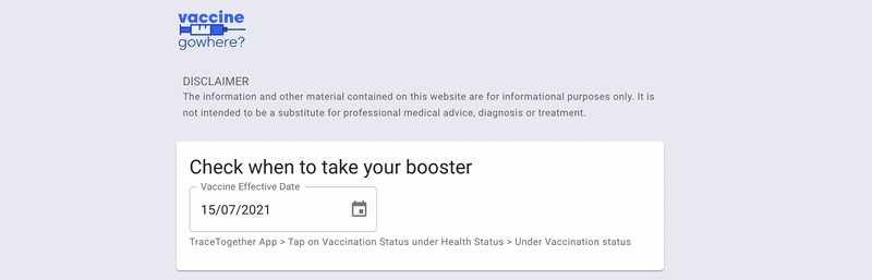 To calculate the vaccine validity is simple — input your Vaccine Effective Date (that is, the date on which your vaccination has taken full effect), which is indicated on your TraceTogether app.