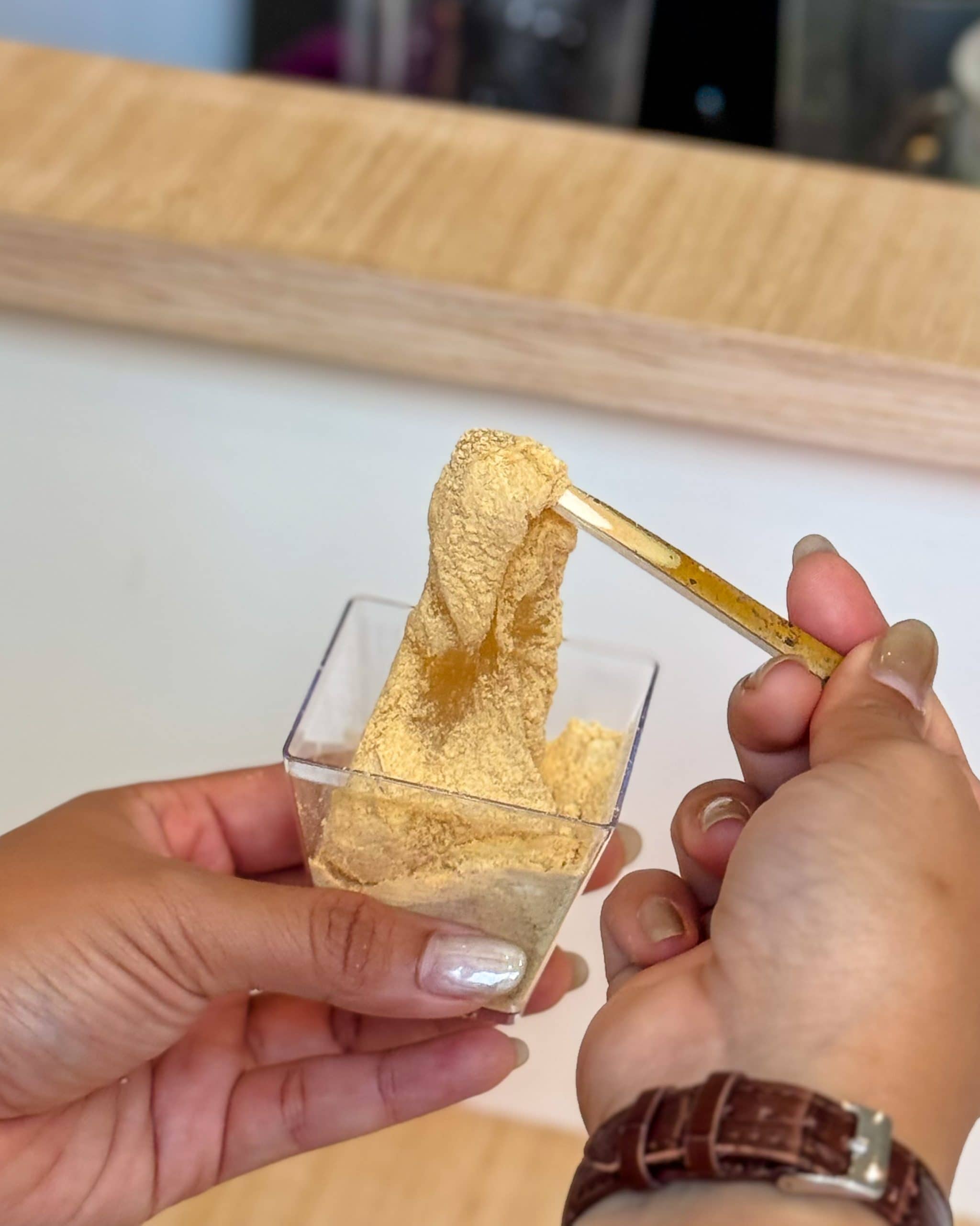 The warabimochi served here is composed of a secret formula that incorporates hard-to-find bracken flour, which yields a chewy, smooth, and melt-in-your-mouth texture, enjoyed with a generous coating of rich and nutty kinako soybean powder. I found it noticeably softer as compared to the warabimochi I’ve tried at some Japanese restaurants.