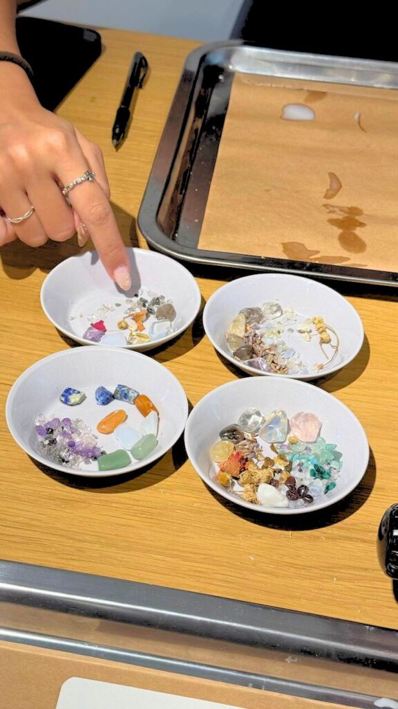 For what felt like hours, we meticulously selected the various crystals, dried flowers, and little decorations we wanted to add to our candles. Every choice felt personal, as if we were crafting tiny pieces of magic just for ourselves.