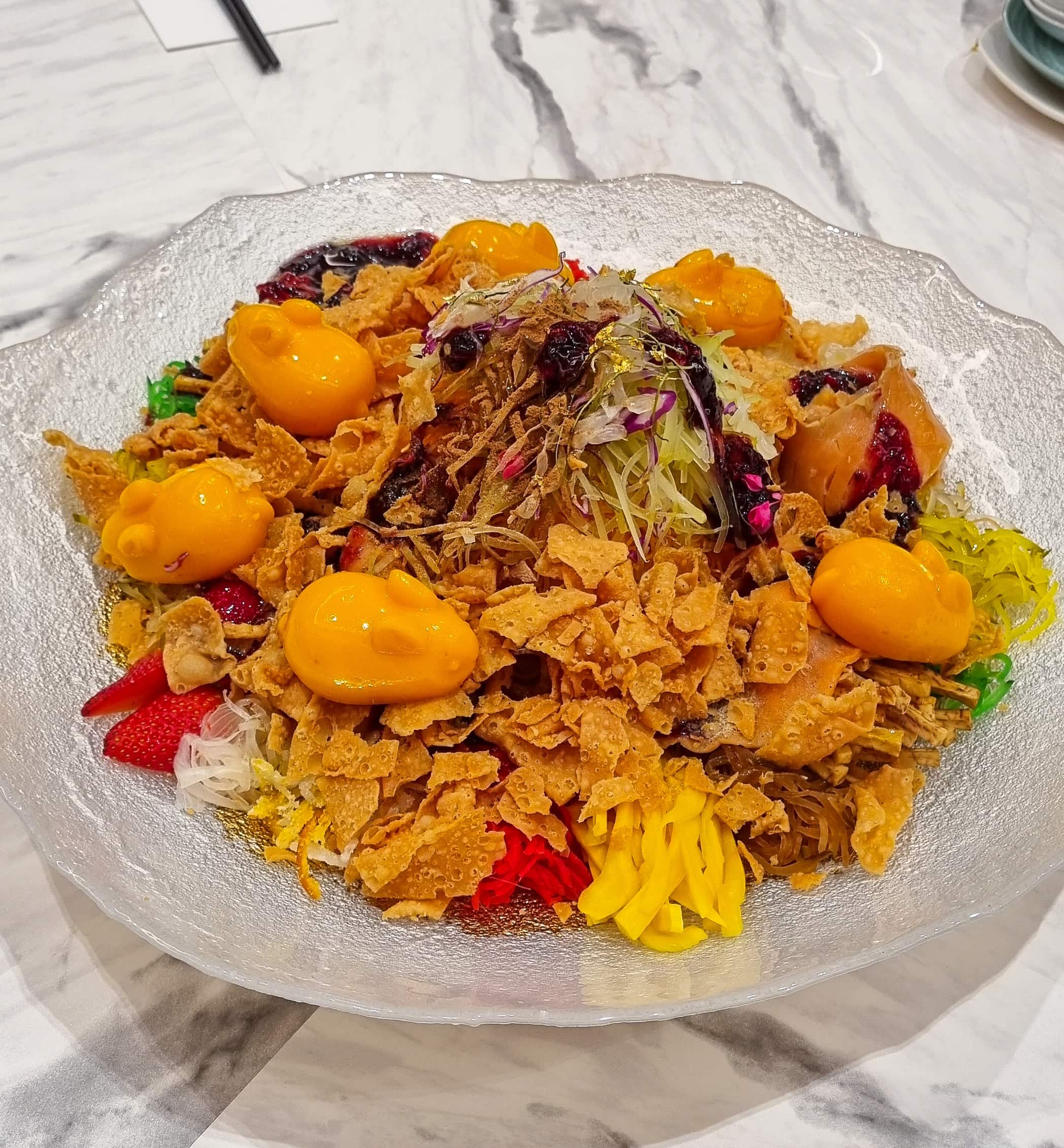 Interestingly, this yusheng is served with a bevvy of bunny mango puddings — not simply enjoyed on the side, but tossed together with all the other ingredients!