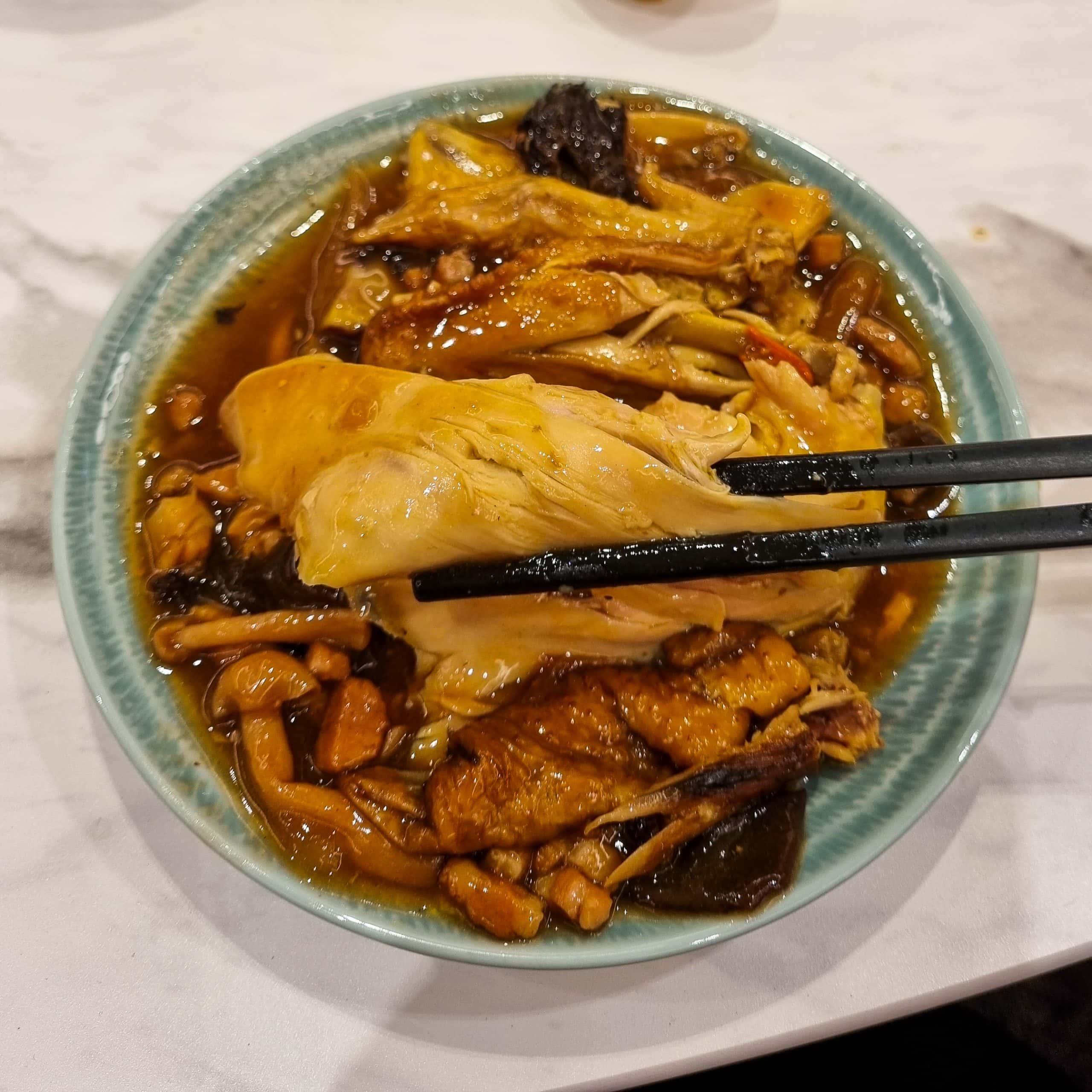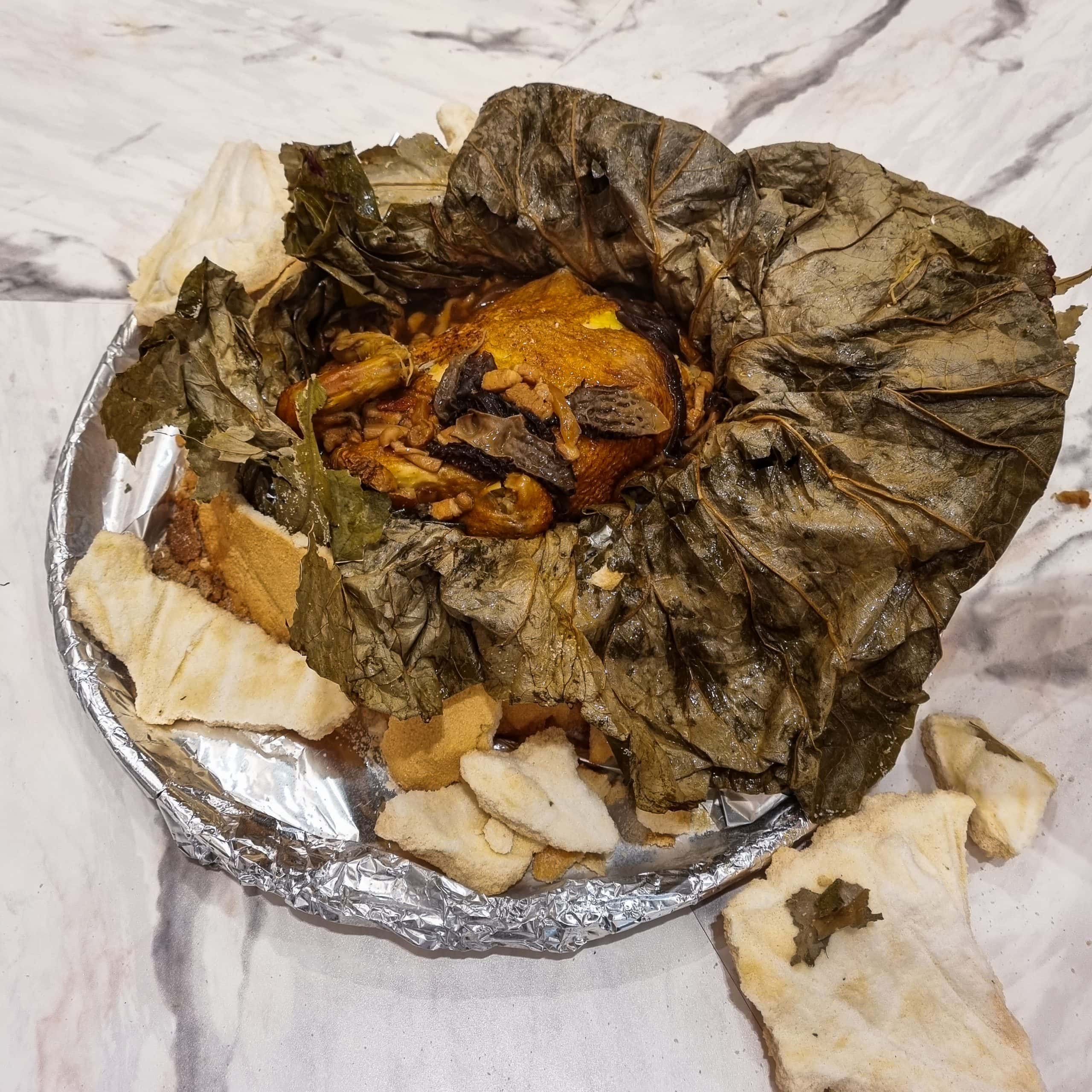 The chicken is wrapped in lotus leaves, encased in a salt dome, and then oven-baked, yielding exceedingly tender meat bathed in a rich and umami abalone sauce.