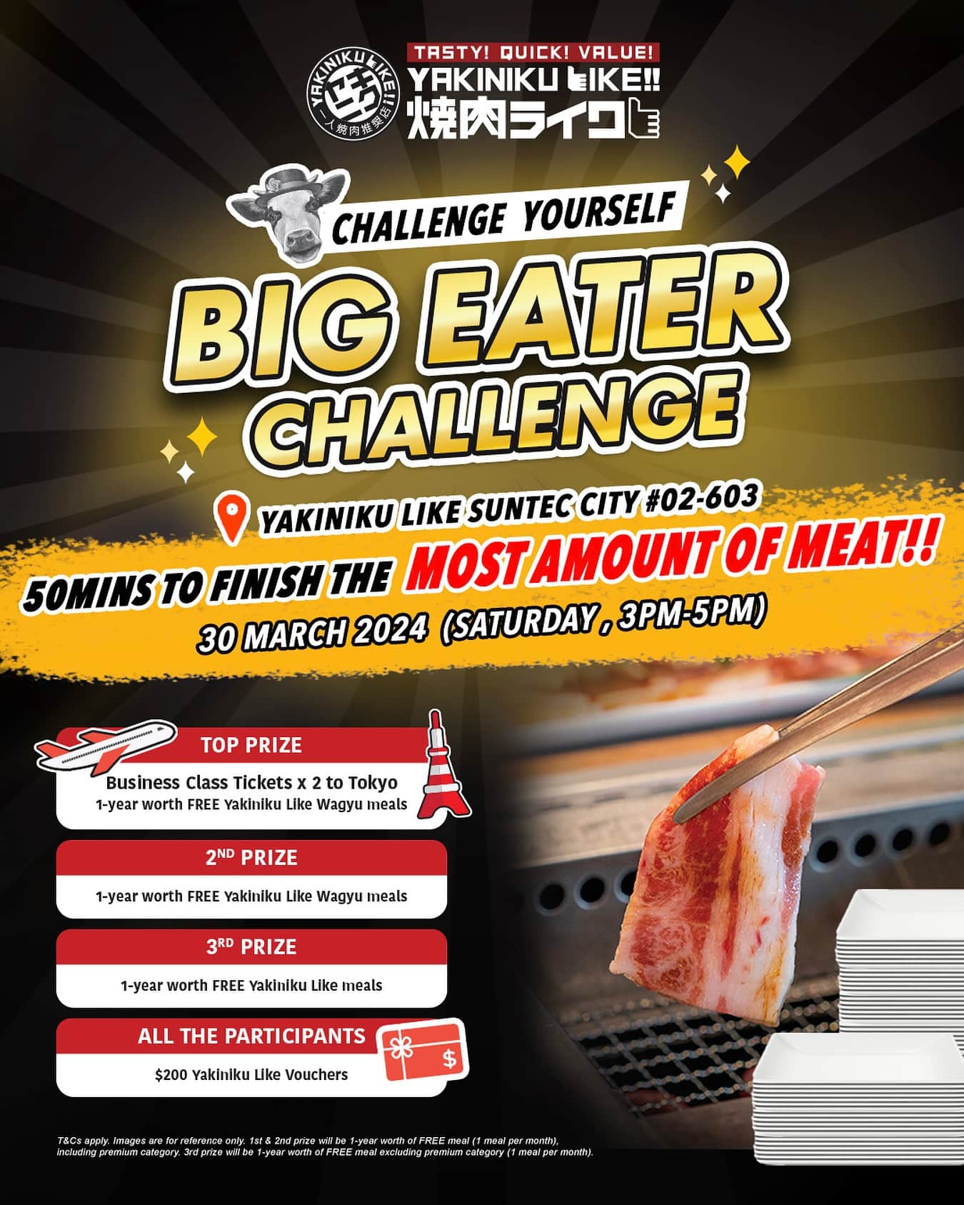 The contest will be taking place for one day only on 30 March 2024 at the Suntec City outlet and other prizes up for grabs include one-year worth of free Yakiniku LIKE wagyu meals, one-year worth of free Yakiniku LIKE meals and S$200 Yakiniku LIKE vouchers. Think you have what it takes? Register to shoot your shot for the business class tickets.