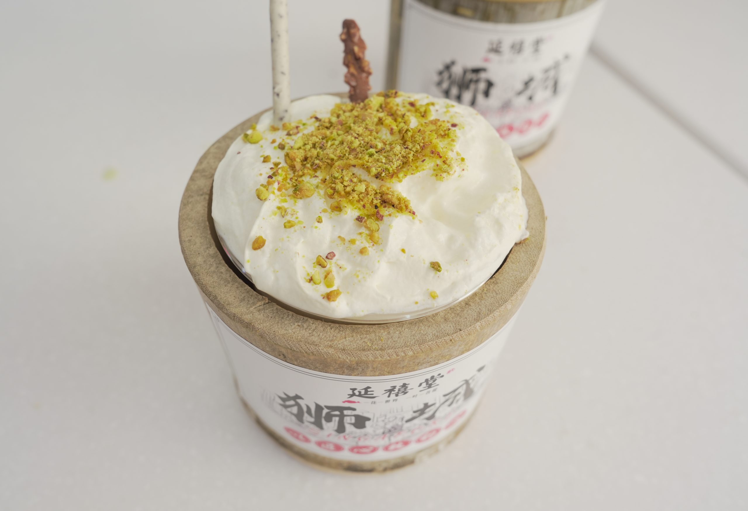 For obvious reasons, the drinks are not poured directly into the bamboo cup. Instead, the drinks are poured into a plastic cup and then placed inside the bamboo barrel. All of the drinks come topped with whipped cream and two sticks of Pepero biscuits.