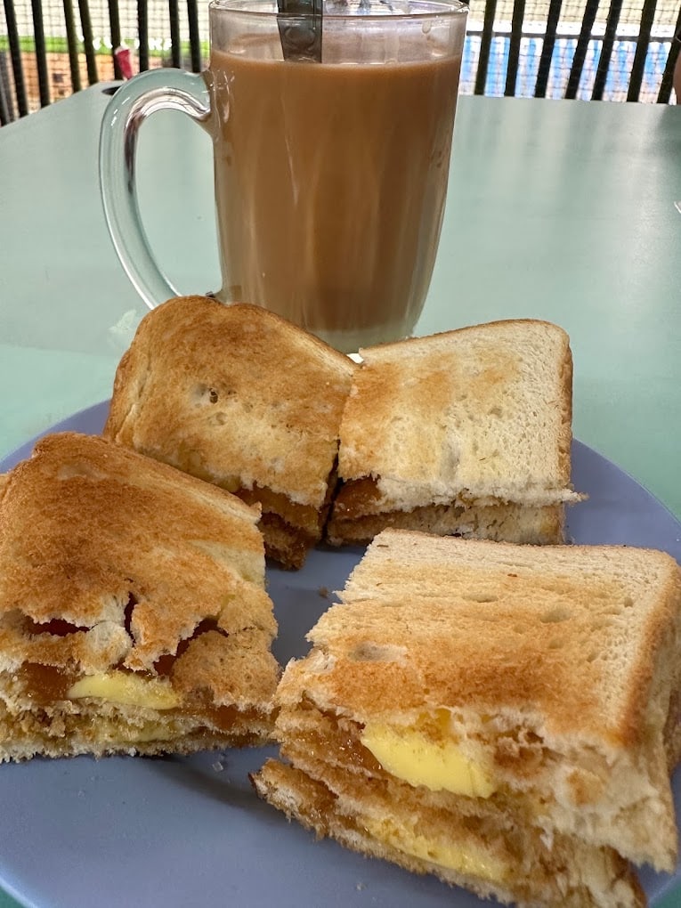 Think crisp, well-toasted bread with Hainanese-style kaya (the brown-hued version with extra caramelly notes), a light sprinkling of sugar, and thick cold slabs of salted butter. You get a nice balance of sweet, salty, and crusty all in a single bite.